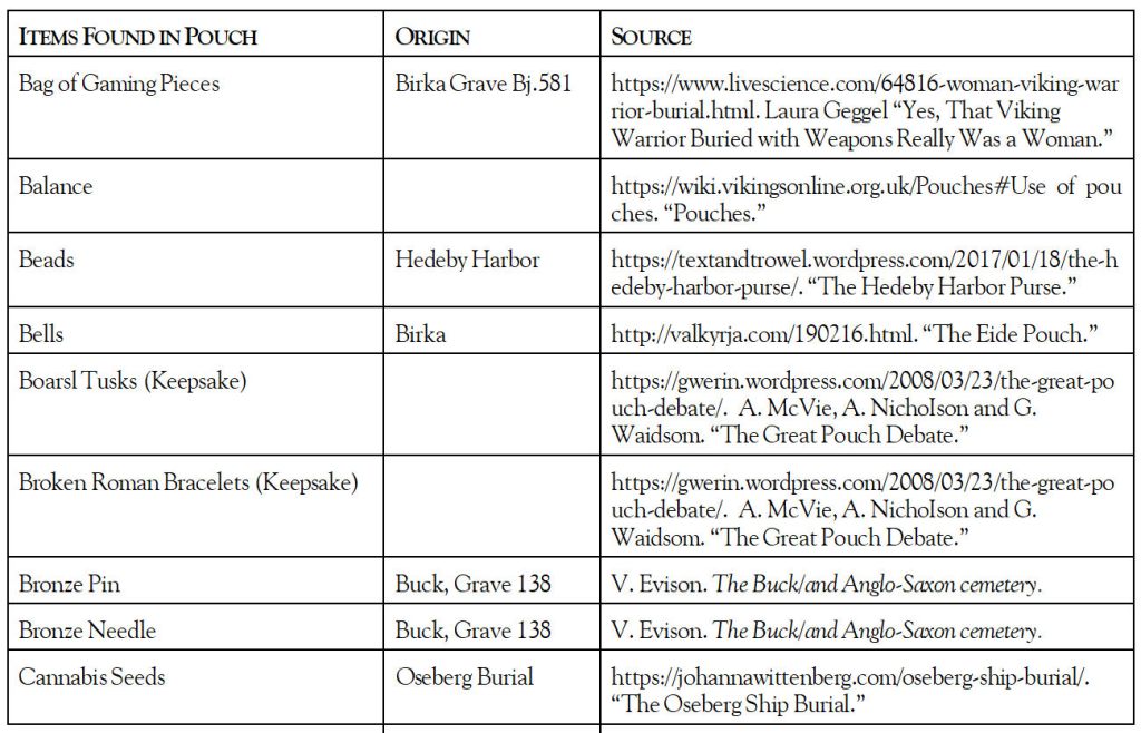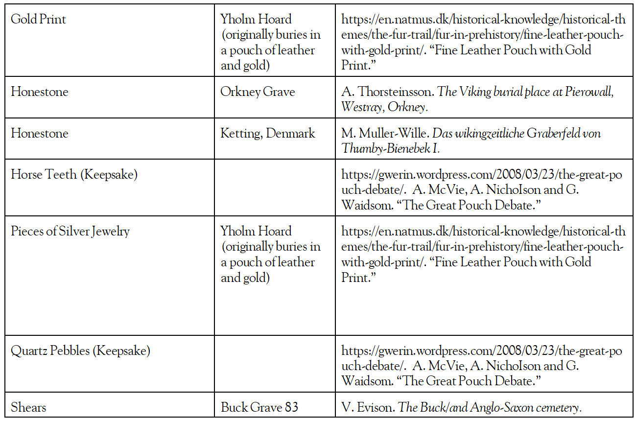 There are few extant pouches that have been found, and there seems to be arelustance to say what they contain–if anything remains. Andrew Nicholson noted in private conversation that, “organic survival is difficult.” “Buried Vikings: Excavating Cumwhitton’s cemetery” notes in Current Archaeology 294 that “Initially, all were X-rayed to determine their contents. Then, using the X-rays as a guide, the blocks were carefully excavated, and the objects stabilised, cleaned, and conserved as they emerged from the encasing soil,” but finding these contents is difficult! This page is not finished and may very well be added to and corrected as we received the information.
