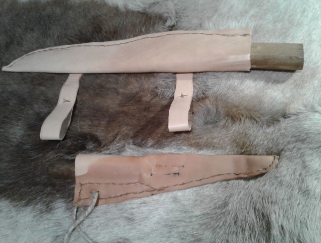 I finished it off by punching a hole into the sheath where it was indicated on the drawing. I used leather on the first and a hemp cord on the second, then attached it to my belt so that it hung usefully at my side. Wearing it tht way in a modern flding chair dangerously entanmgled it, so using a period stool or bech is more important than just being accurate!