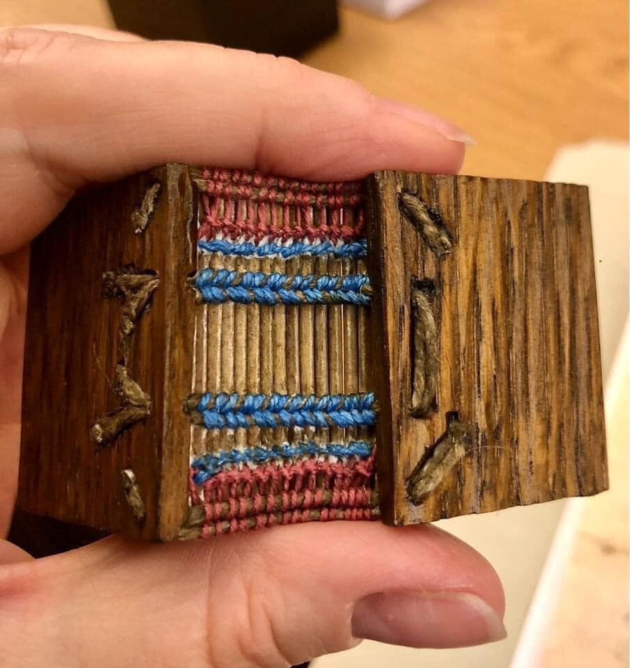 Place this folded dummy into the folded signature, and—using an awl—pierce the signature at the marks. To sew these signatures, use thread—linen or hemp. I use the Coptic binding method I use on Cuthbert Gospel style bindings. These signatures are then compressed for two or three days. I cut front and back covers into of approximately 5.75 x 7 cm rectangles of 3 centimeters thick of poplar, though oak or another hard wood would also be valid. Keep in mind in the age before mass production, most things were manually made and some minor variations are expected.